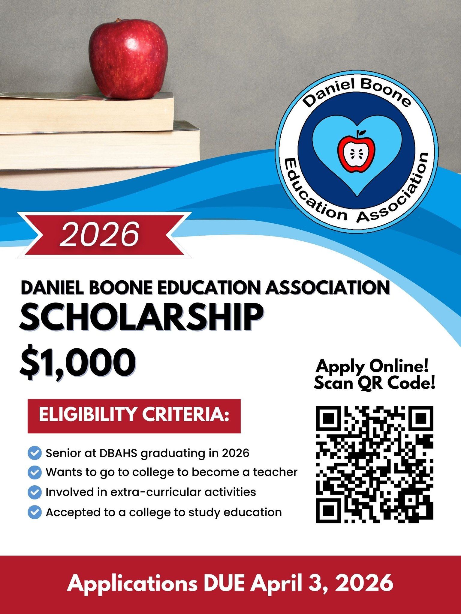 The Daniel Boone Education Association (DBEA) is offering a $1,000 scholarship to a Daniel Boone Area High School senior graduating in 2026 who plans to pursue a career in education.